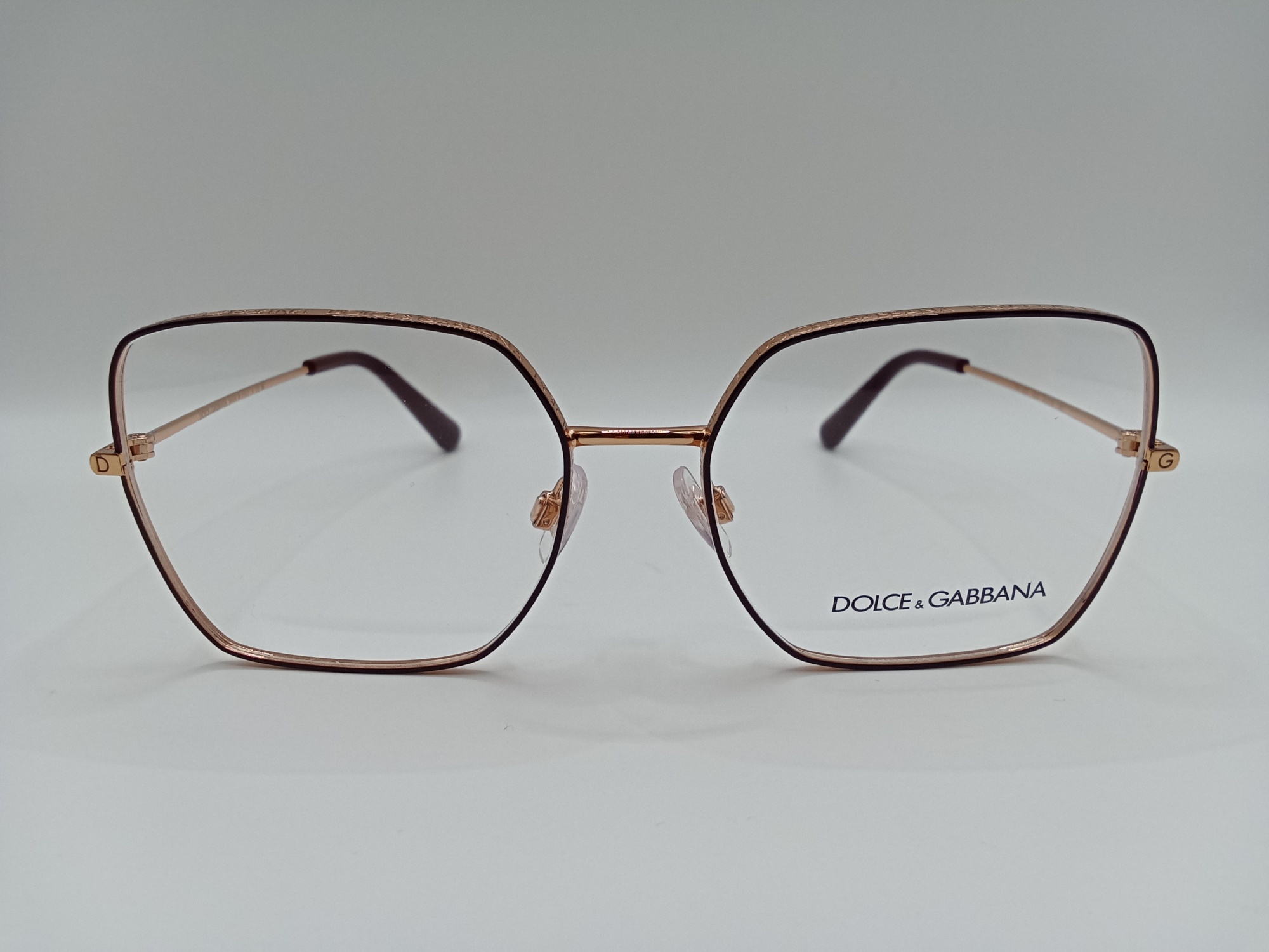 Oprawka korekcyjna Dolce & Gabbana DG 1323 1333 54-16-140 o kwadratowym kształcie jest wykonana z metalu. Ma miedziany odcień złota z bordową obwódką na froncie.