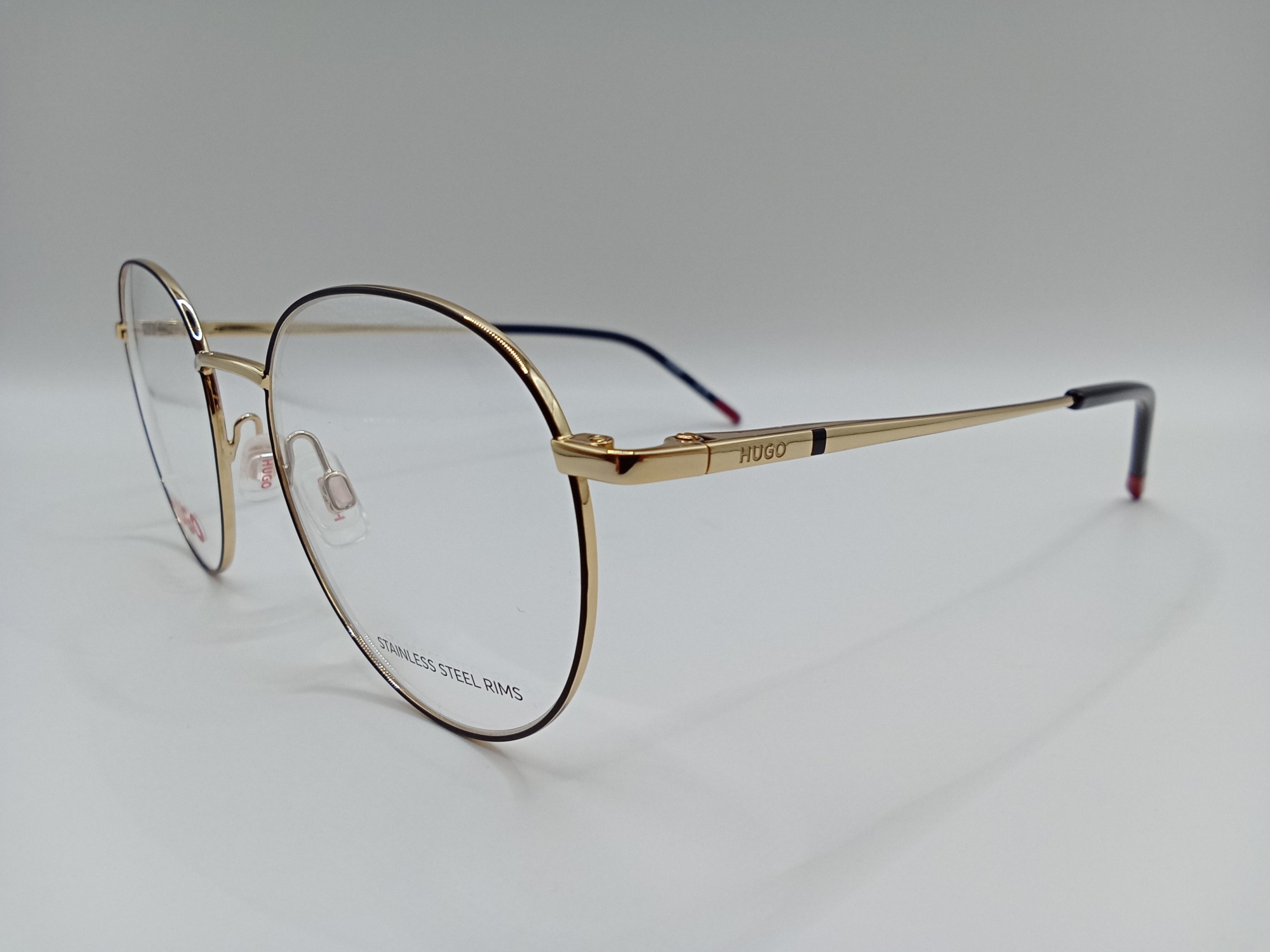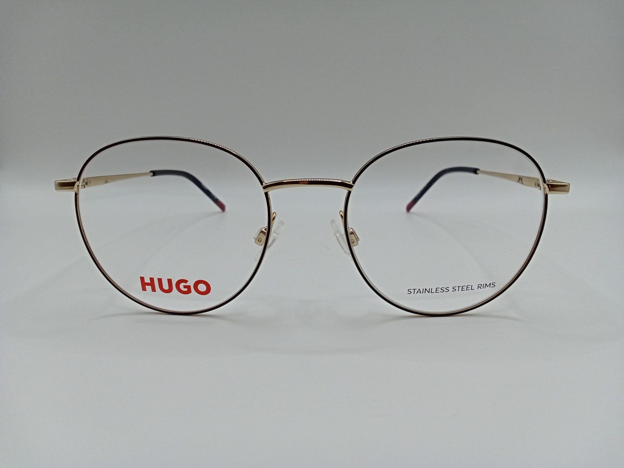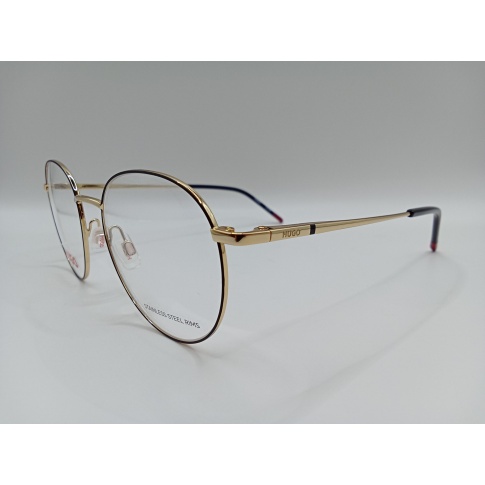 Metalowa oprawka Hugo Boss HG 1326 RHL o ponadczasowym, okrągłym kształcie, który idealnie sprawdzi się u osób o kwadratowej, prostokątnej i trójkątnej twarzy. Wykonana z materiałów najwyższej jakości. Oprawa jest wygodna i trwała. Obwódka na froncie w kolorze czarnym, natomiast mostek i zauszniki w złotym. Ta oprawka korekcyjna świetnie uzupełni każdą stylizację.