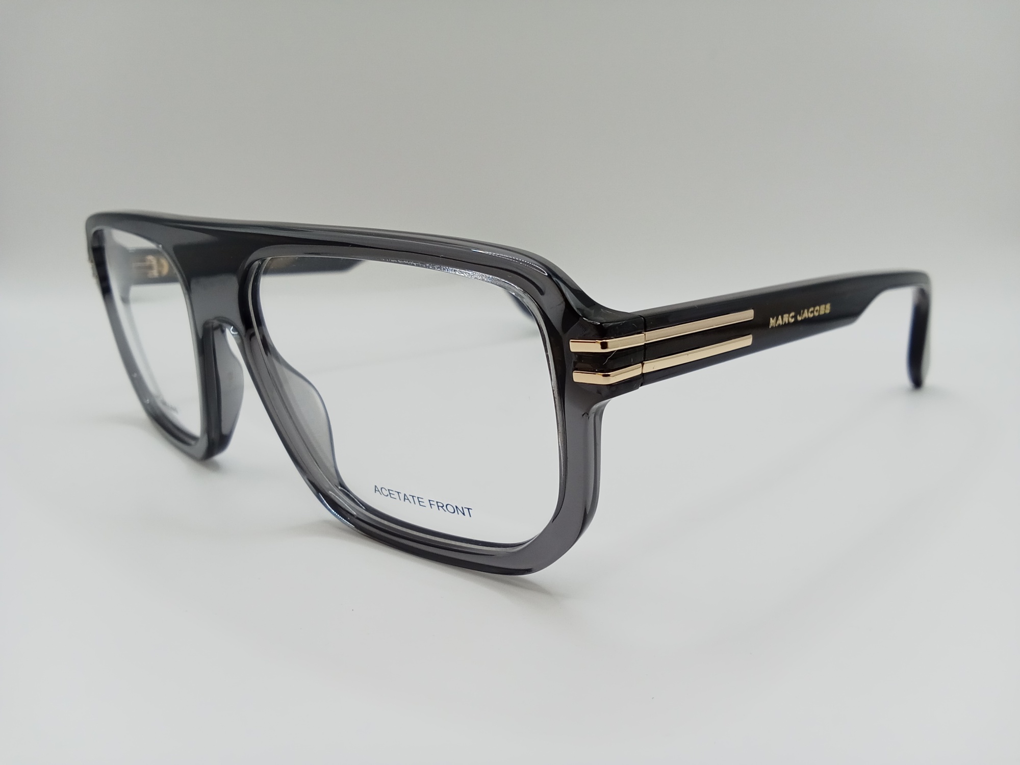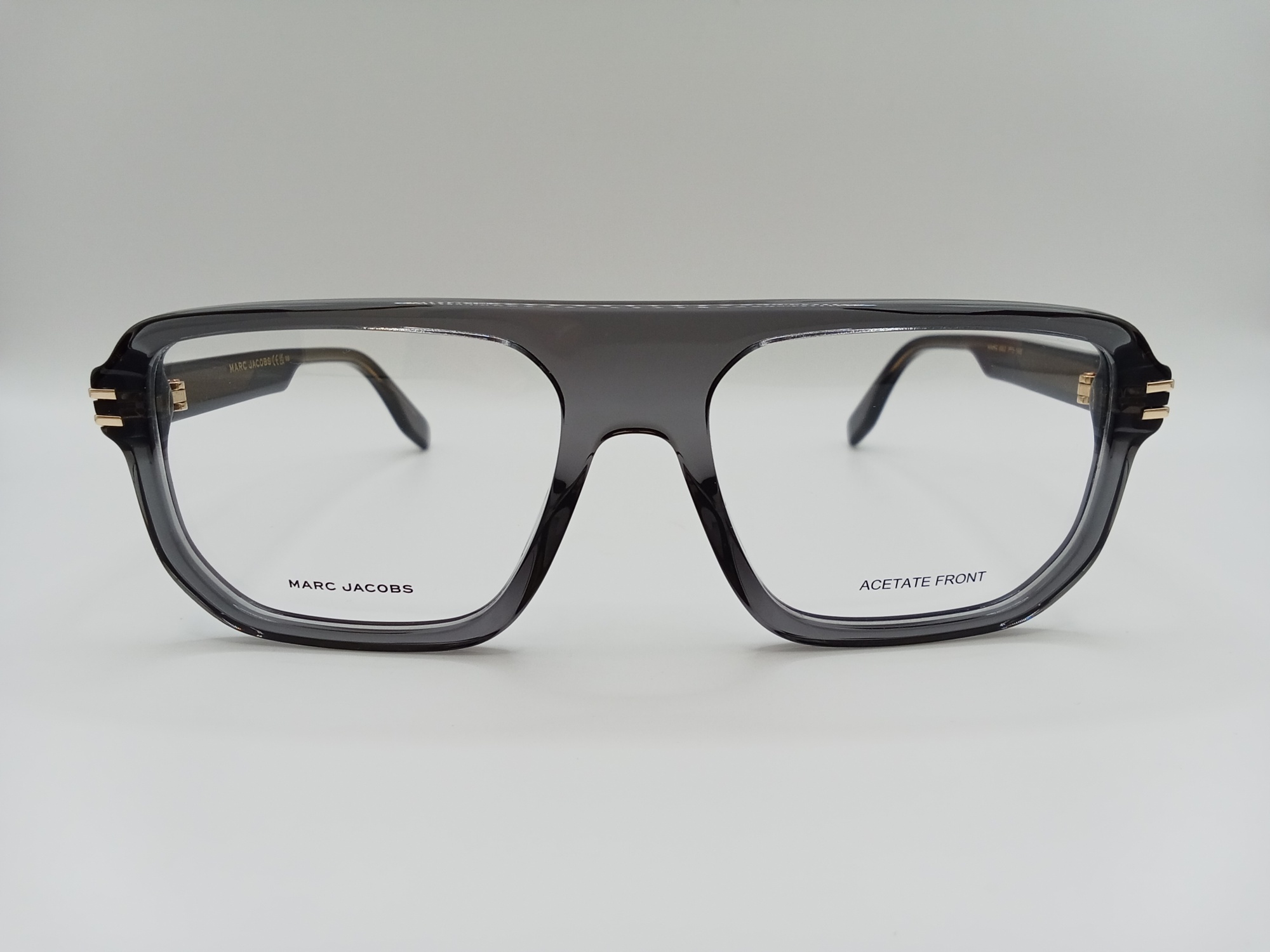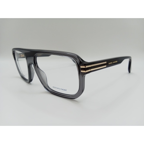 Prostokątna oprawka korekcyjna MARC 682 FT3 marki Marc Jacobs jest wykonana z wysokiej jakości plastiku w kolorze przezroczystym z szarym odcieniem. Złote elementy na zausznikach i po obu stronach frontu sprawiają, że oprawa jest jeszcze bardziej elegancka i stylowa.