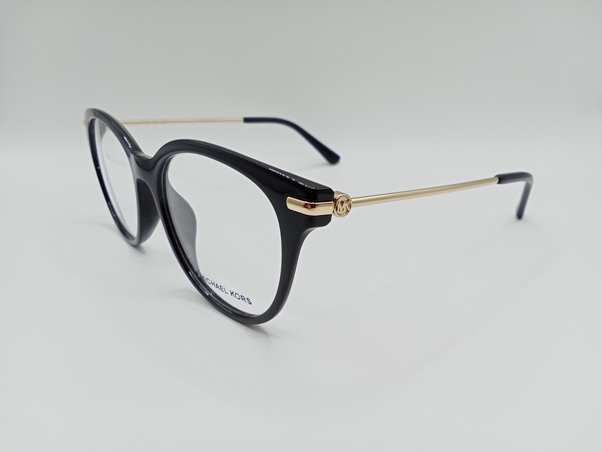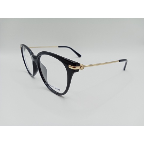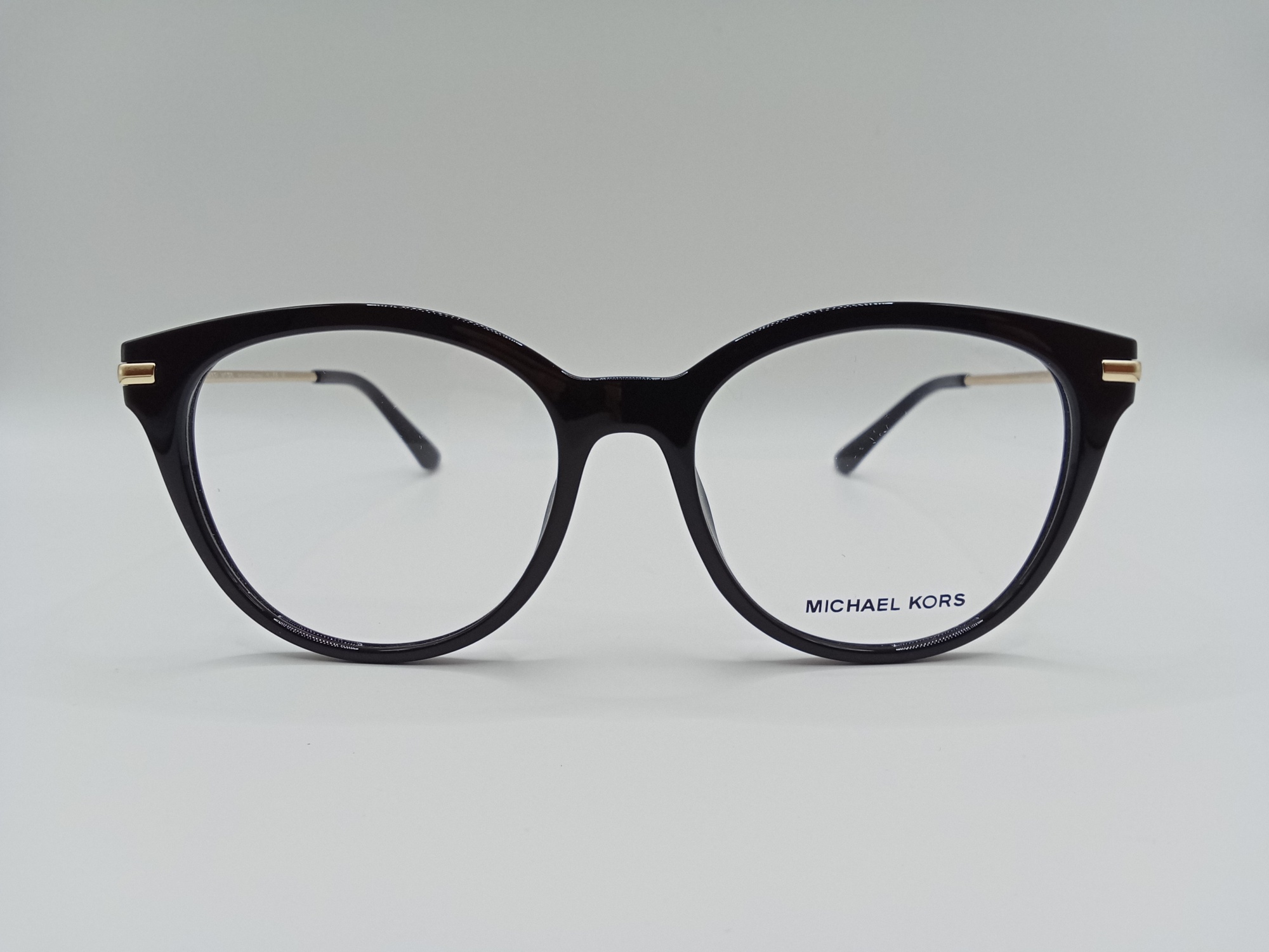 Oprawa korekcyjna Michael Kors MK 4135U(Tortola) 3005 ma ponadczasowy, okrągły kształt. Front wykonano z plastiku w kolorze czarnym, a metalowe zauszniki w odcieniu złota.