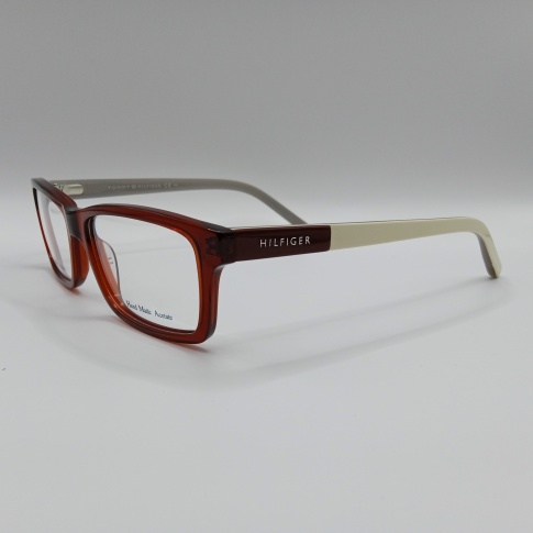 TH 1132 Oprawka typu unisex w prostokątnym kształcie, wykonana z wysokiej jakości tworzywa w kolorze czerwonym, transparentnym na froncie, zauszniki w kolorze szaro- kremowym.
