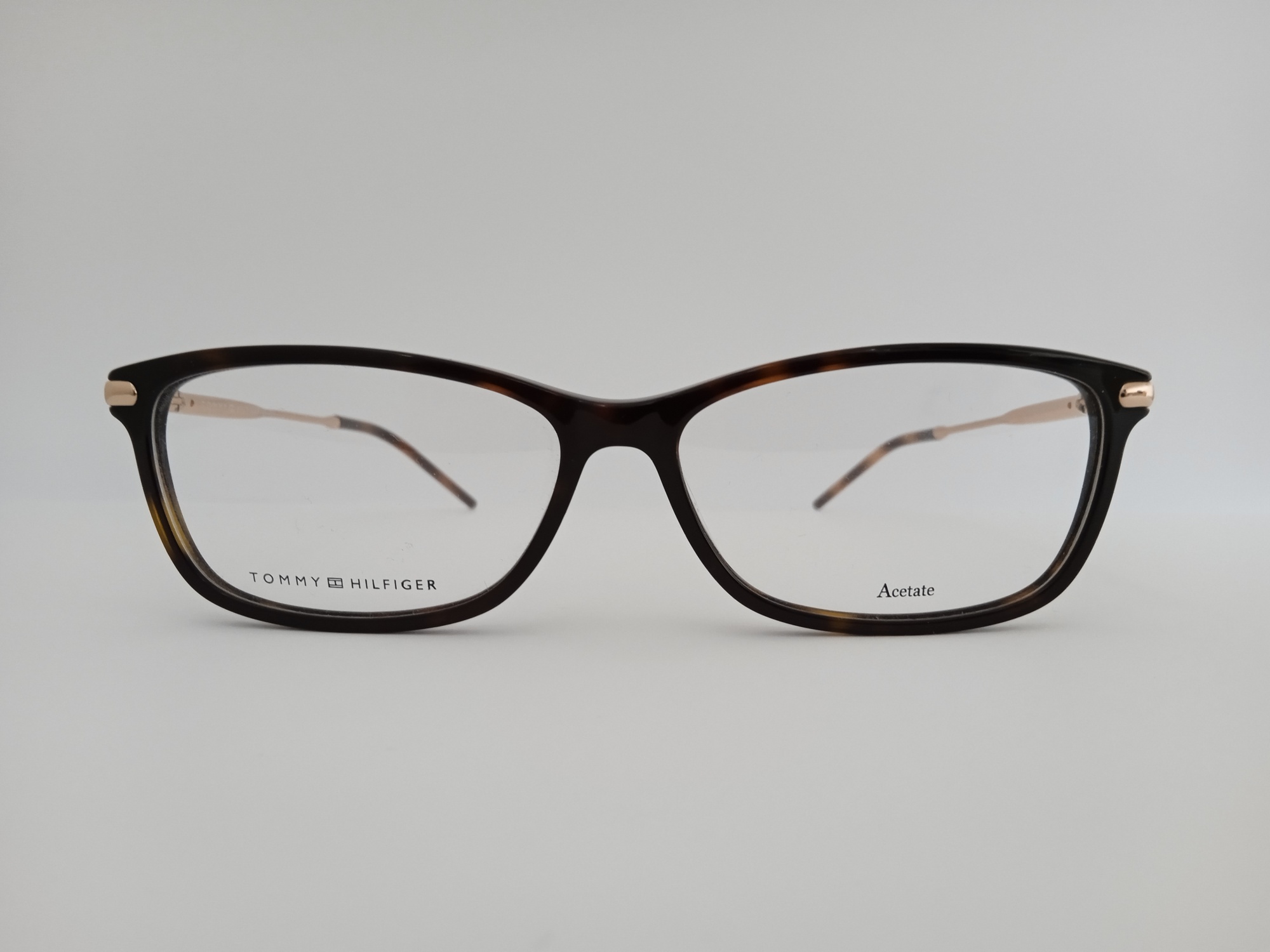 Okulary z tworzywa sztucznego, tak jak te, łączą trwałość z komfortem noszenia. Model TH 1636 to klasyczny prostokątny kształt w kolorze szylkretu z metalowym zausznikiem w kolorze złota.
