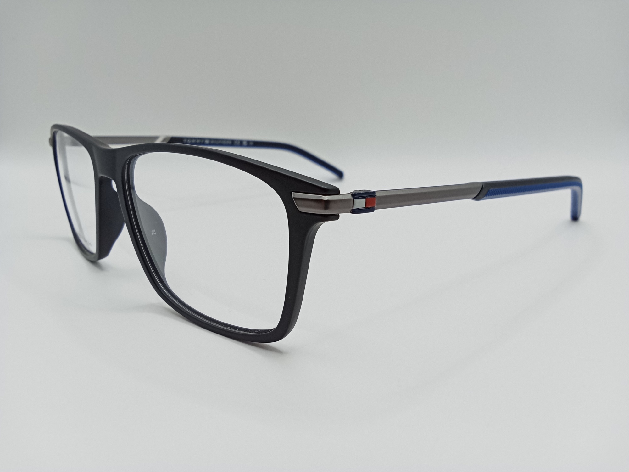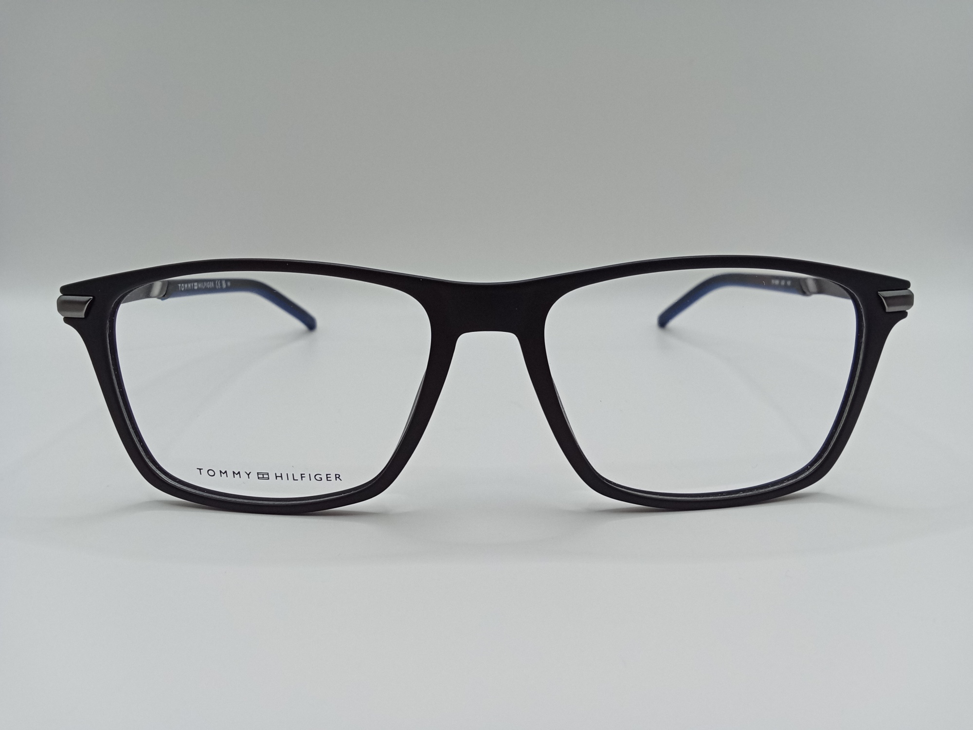 Oprawkę Tommy Hilfiger TH 1995 003 wykonano z wysokiej jakości tworzywa. Jest lekka, wygodna i trwała. Ma klasyczny, prostokątny kształt. Oprawa jest czarna w macie z granatowymi wstawkami na zausznikach.