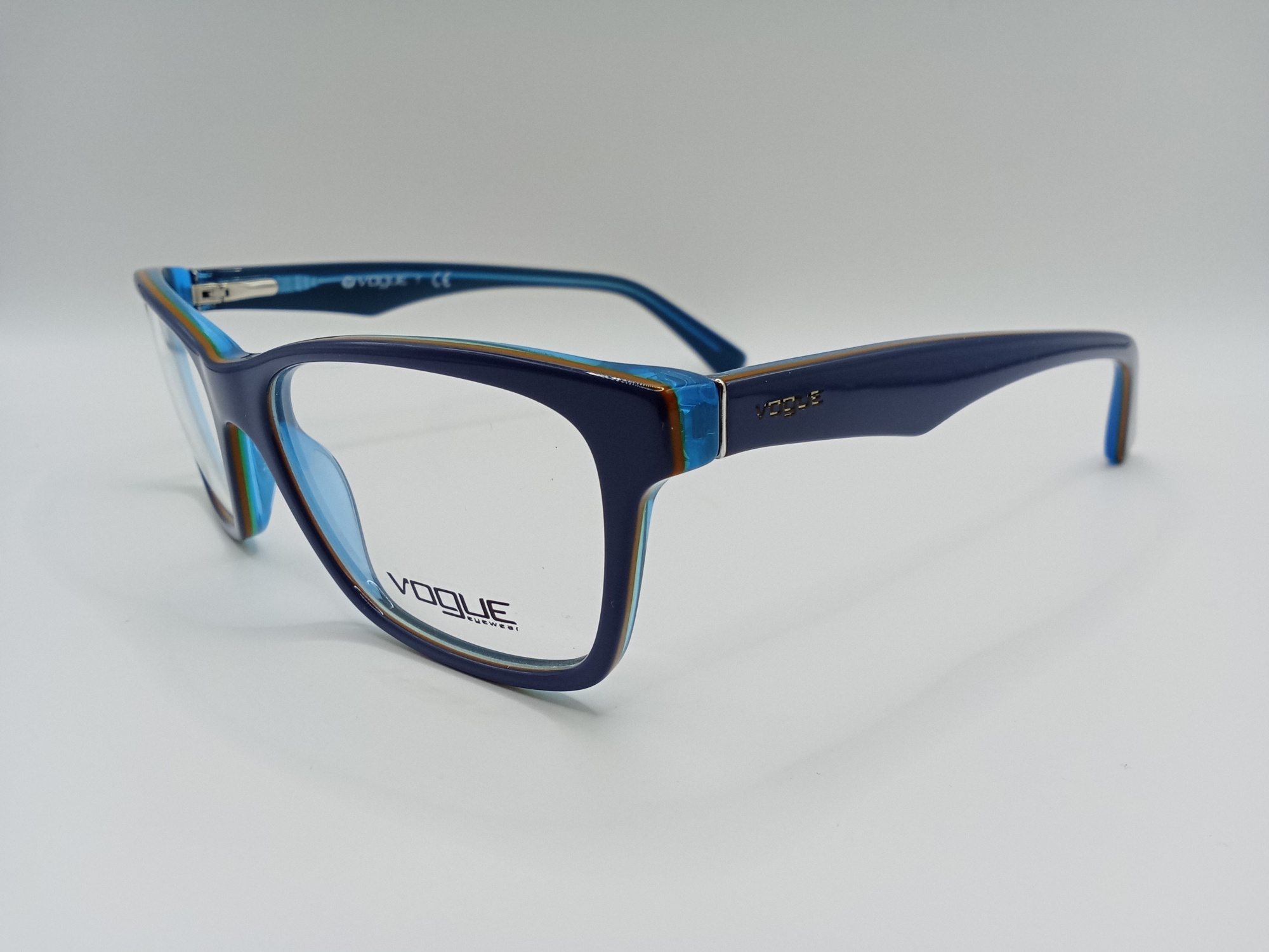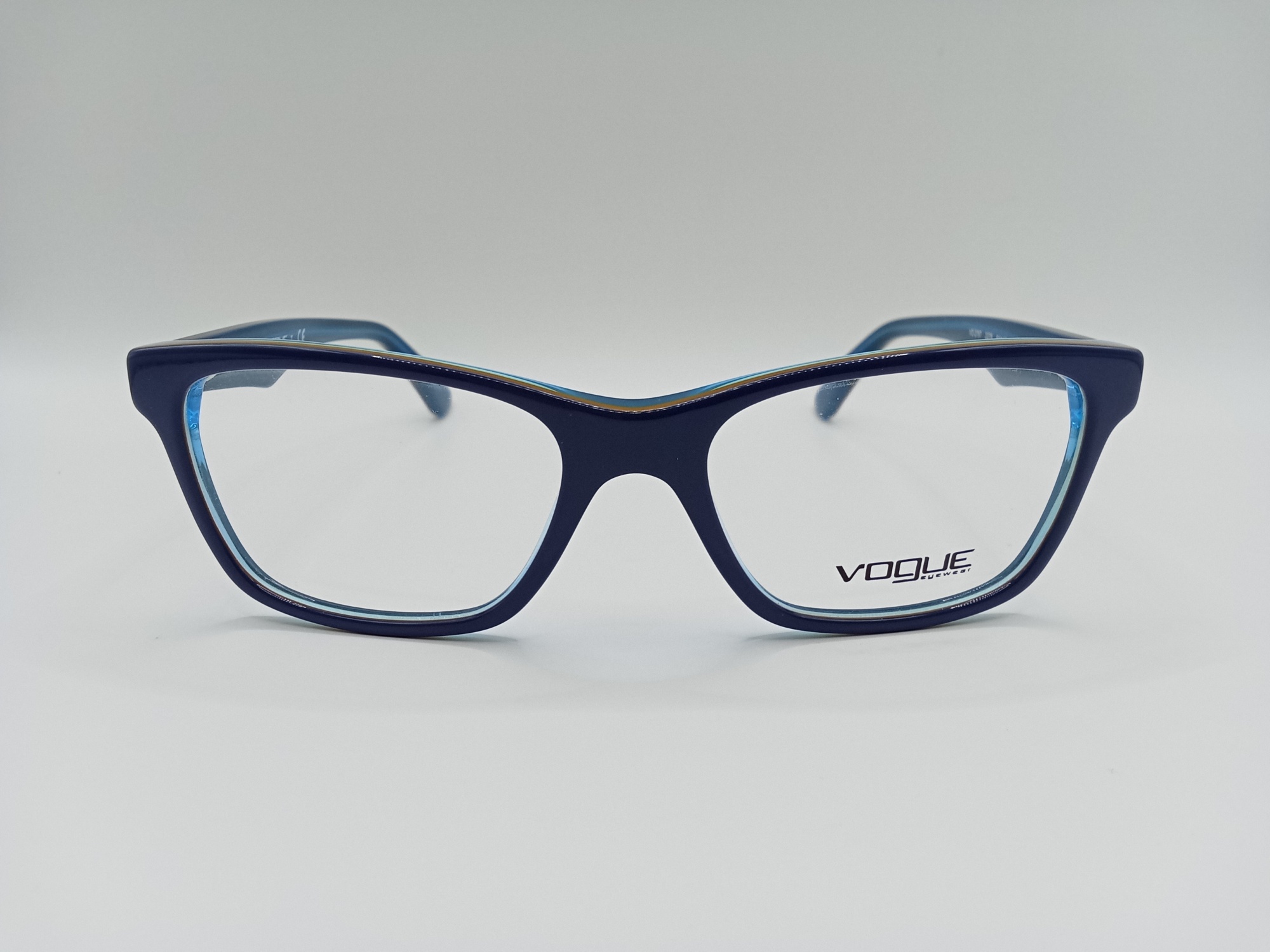 Plastikowa oprawka Vogue VO 2787 2278 ma koci kształt. Kolorystyka fioletowo-niebiesko-musztardowa. To połączenie barw sprawia, że jest ona jeszcze bardziej oryginalna i ma nowoczesny design.