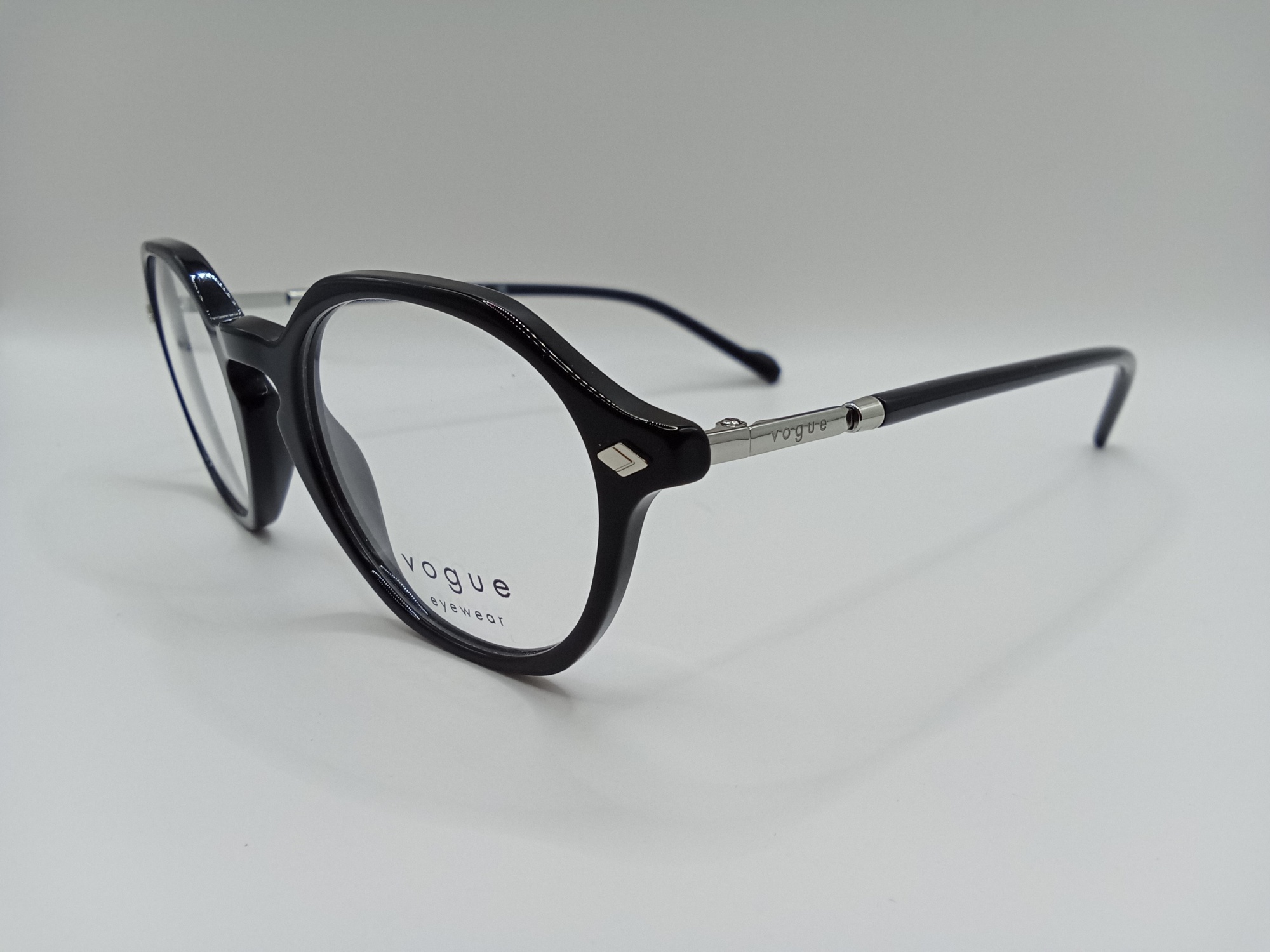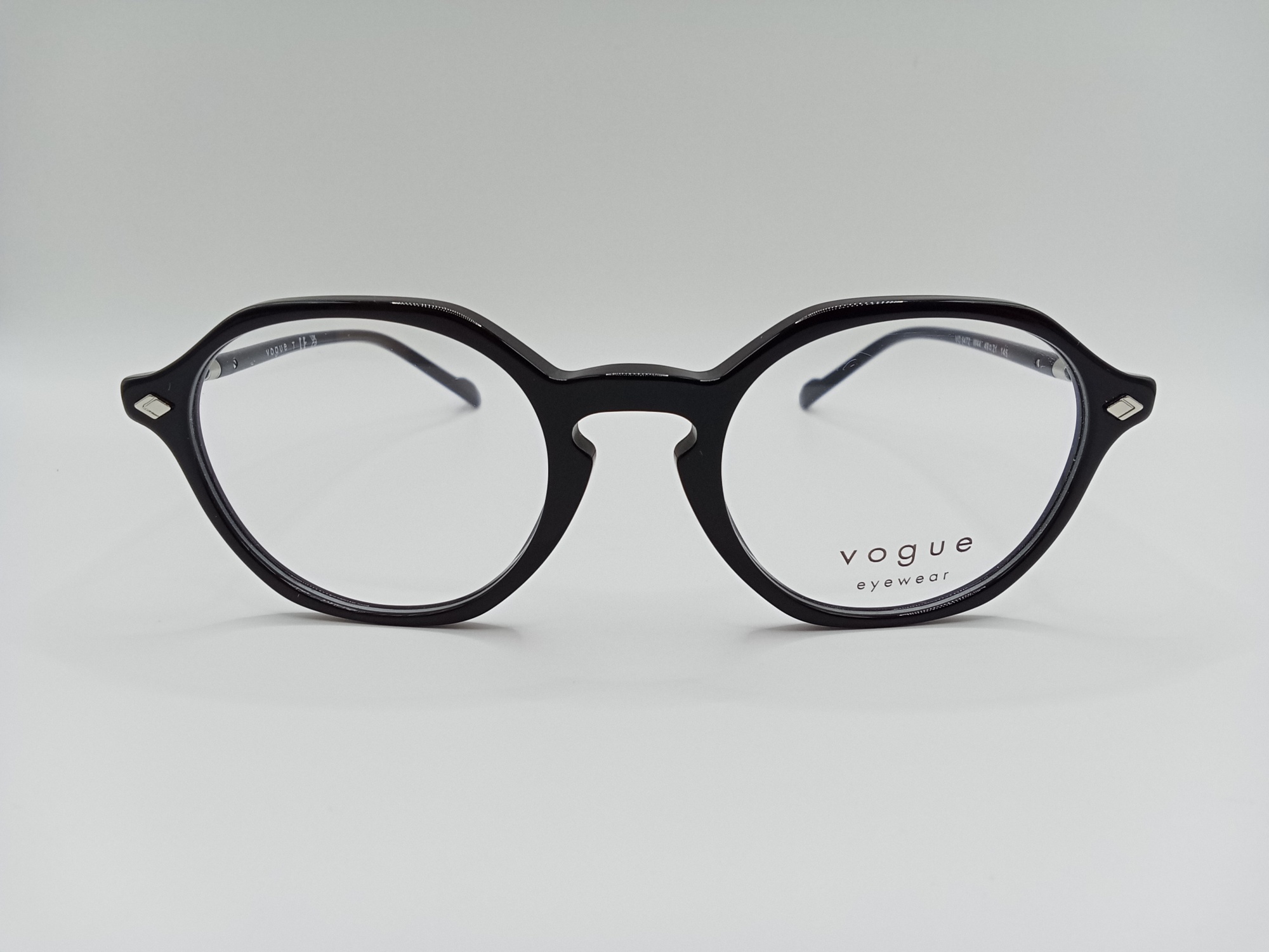 Oprawka Vogue VO 5472 W44 ma ciekawy, geometryczny kształt. Wykonano ją z wysokiej jakości tworzywa w czarnym kolorze. Na zausznikach ma metalowe elementy w srebrnym odcieniu.
